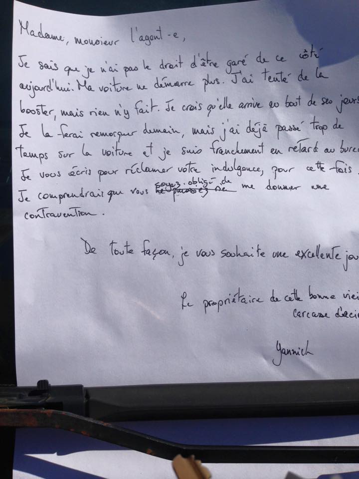 À court de solutions, à court de temps surtout, j’ai dû me résigner à laisser la voiture là, bientôt en toute illégalité. Avec l’espoir d’éviter une contravention, j’ai donc entrepris de laisser un mot dans le pare-brise, à l’usage de l’agent de stationnement, que voici d’ailleurs :